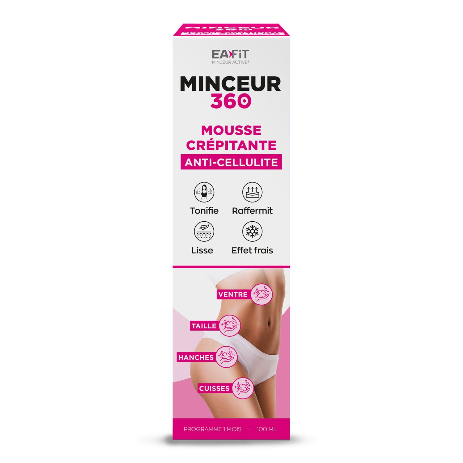 La mousse crépîtante et légère de la gamme Minceur 360 est spécialement conçue pour aider à tonifier, raffermir et lisser la peau. Grâce à une combinaison d’actifs reconnus, elle agit efficacement pour réduire l’aspect de la cellulite, améliorer la microcirculation sanguine et stimuler le drainage.